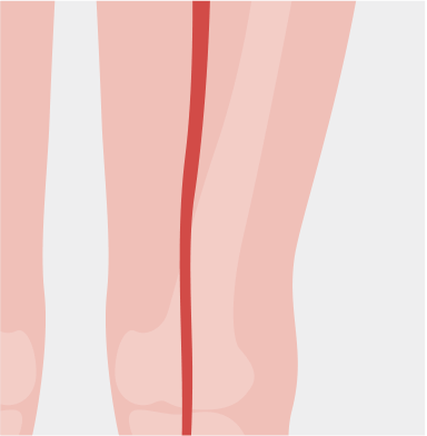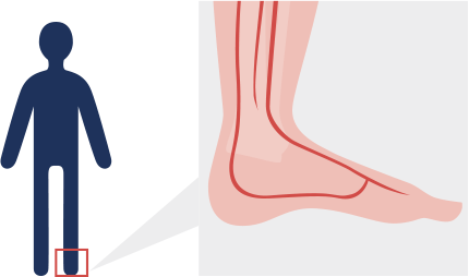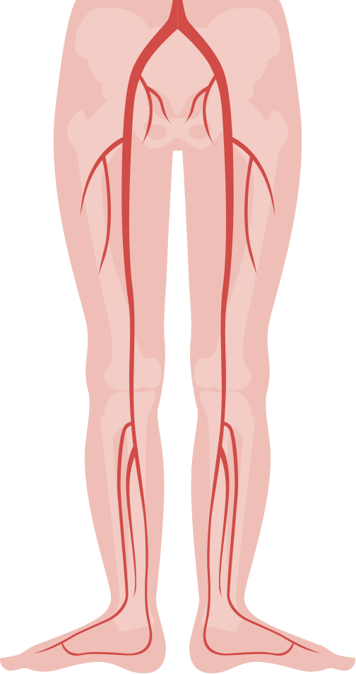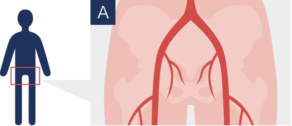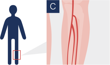 高血圧、糖尿病、脂質異常症、喫煙、加齢などにより動脈硬化が生じます。動脈硬化は動脈の内腔を狭小化させ、各臓器への血流を低下させてしまいます。下肢への血流を担っている血管は腹部動脈から左右に分かれ、腸骨動脈(A)、大腿動脈、膝窩動脈(B)、下腿動脈(C)となります。