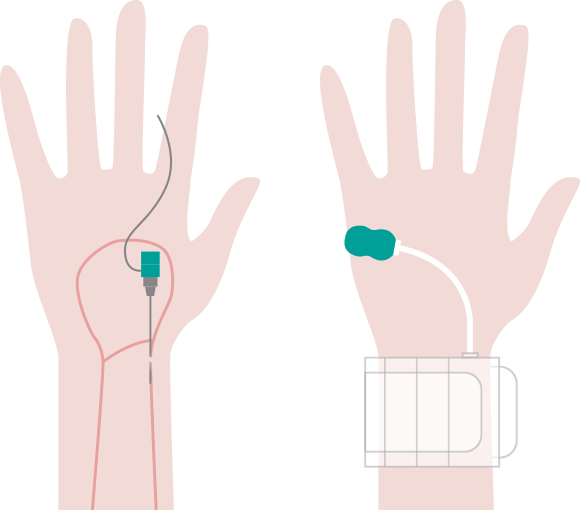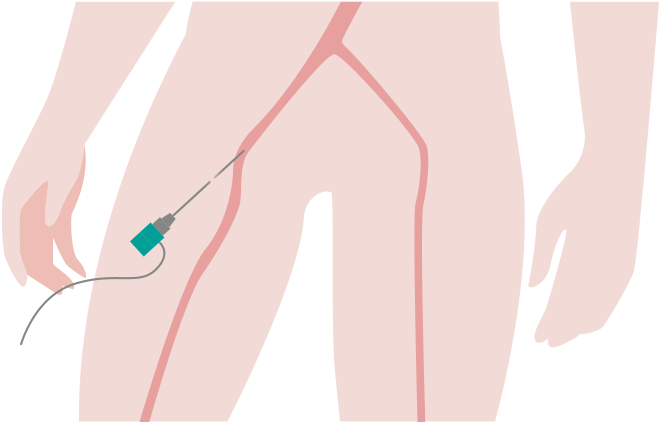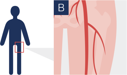 カテーテル治療は、主に足の付け根(鼠径部)や上肢(手首、肘)からカテーテルと言われる直径2mm程度の柔らかい管を用いて行います(E, F)。