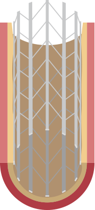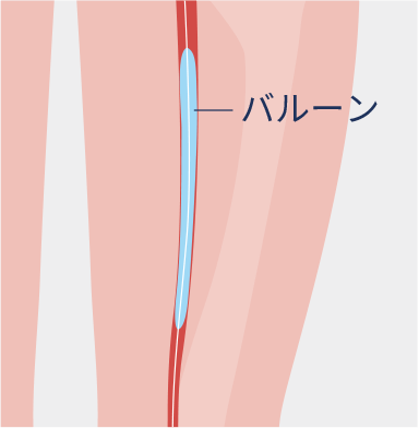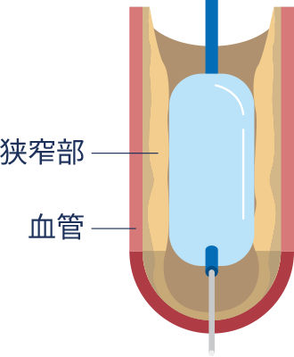 カテーテル治療には、バルーン治療(風船治療)(G)、ステント治療(H)があります。バルーンとは細いカテーテルの先端にバルーンが付いており、それを狭窄(閉塞)部で膨らませ、その後、バルーンを萎(しぼ)ませて抜くことで病変部が拡張される治療のことです。